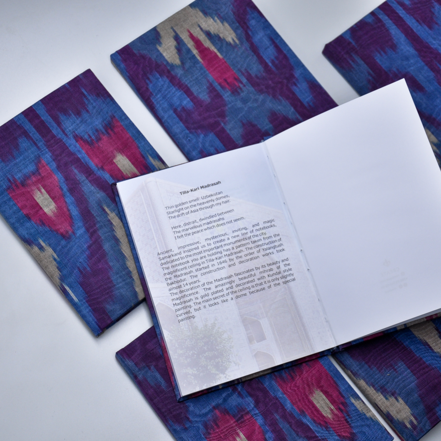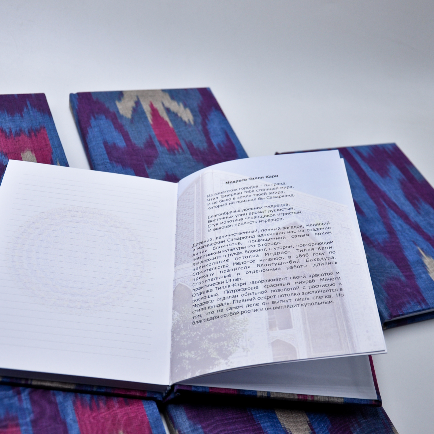 Коллекция национальных блокнотов Create, посвящённая городу Самарканд – это сочетание качества и национального колорита, приправленных интересными историческими фактами. Для дизайна листов был выбран узор одного из самых известных архитектурных памятников – медресе Тилла Кари. В конце каждого блокнота вы найдёте описание, подробно рассказывающее историю уникального сооружения на 2 языках (русском и английском). Обложка выполнена из яркого шелкового адраса. Блокнот полностью собран вручную, что придаёт ему еще большую ценность и гарантирует отменное качество. Размер: А5. Количество листов: 80 листов. Плотность бумаги: 100 гр/м3