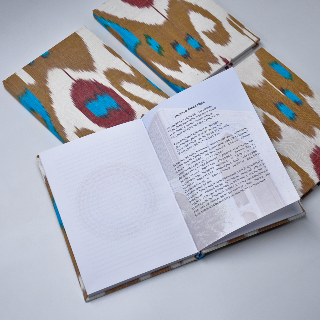 Коллекция национальных блокнотов Create, посвящённая городу Самарканд – это сочетание качества и национального колорита, приправленных интересными историческими фактами. Для дизайна листов был выбран узор одного из самых известных архитектурных памятников – медресе Тилла Кари. В конце каждого блокнота вы найдёте описание, подробно рассказывающее историю уникального сооружения на 2 языках (русском и английском). Обложка выполнена из яркого шелкового адраса. Блокнот полностью собран вручную, что придаёт ему еще большую ценность и гарантирует отменное качество. Размер: А5. Количество листов: 80 листов. Плотность бумаги: 100 гр/м3