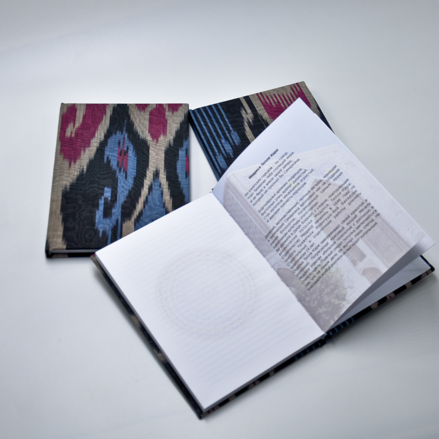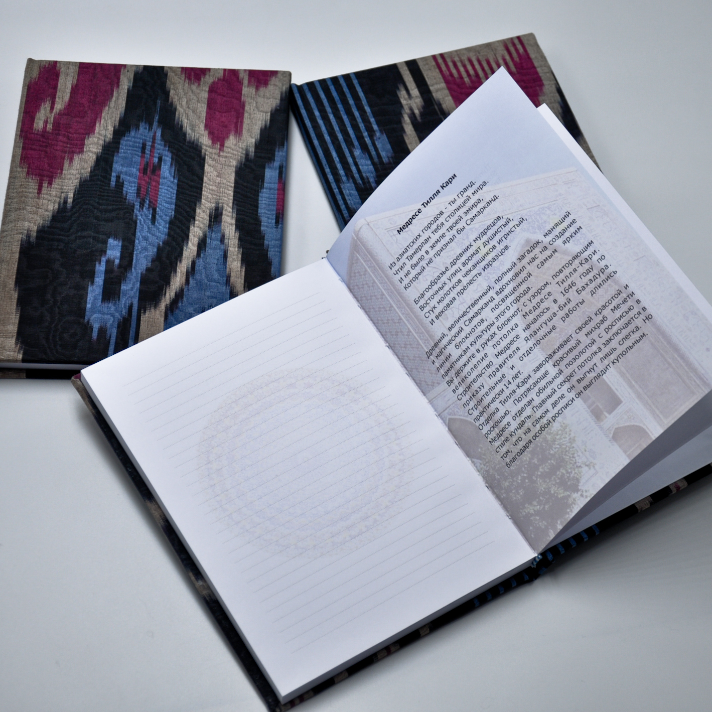 Коллекция национальных блокнотов Create, посвящённая городу Самарканд – это сочетание качества и национального колорита, приправленных интересными историческими фактами. Для дизайна листов был выбран узор одного из самых известных архитектурных памятников – медресе Тилла Кари. В конце каждого блокнота вы найдёте описание, подробно рассказывающее историю уникального сооружения на 2 языках (русском и английском). Обложка выполнена из яркого шелкового адраса. Блокнот полностью собран вручную, что придаёт ему еще большую ценность и гарантирует отменное качество. Размер: А5. Количество листов: 80 листов. Плотность бумаги: 100 гр/м3