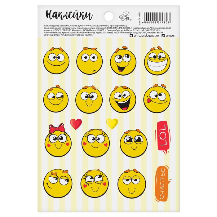 Наклейки бумажные “Смайлики”, 11 х 16 см