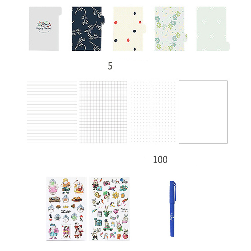 Внутри:rnРазделители – 5лrnЛисты для записей (клетка, линейка, точка, скетч) по 25л – 100лrnНаклейки – 2лrnРучка – 1 шт