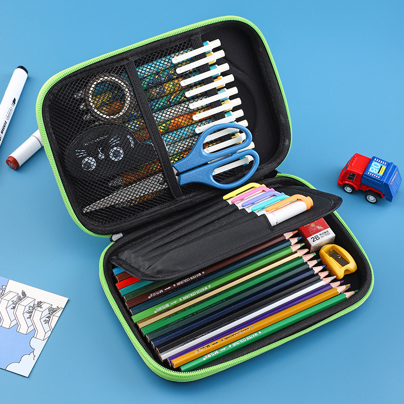 Высококачественный материал EVA делает пенал более прочным и легким. Гладкий материал устойчив к загрязнениям, водонепроницаем и легко чистится. Два широких открытых эластичных сетчатых кармана вмещают до 30 ручек или карандашей обычного размера. Отделение на 5 ручек в средней перегородке вмещает 5 часто используемых ручек. Больше места под перегородкой можно использовать для хранения ластика, степлера, ножниц, карточек, правил, небольшого блокнота и так далее.