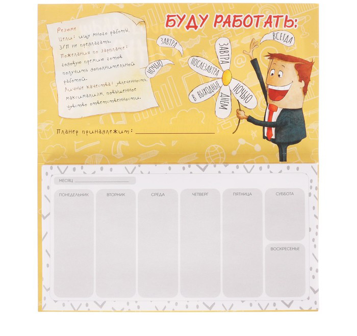 Еженедельный планер – удобство, качество и красота в одном флаконе, где каждую неделю можно начать с чистого листа, листы отрывные и разделенные на графы по неделям, элегантный паттерн делают этот планер незаменимым на рабочем столе или в сумочке человека, который знает толк в стиле и не хочет забыть ни единого момента из своего списка дел. 50 листов идеального планинга.