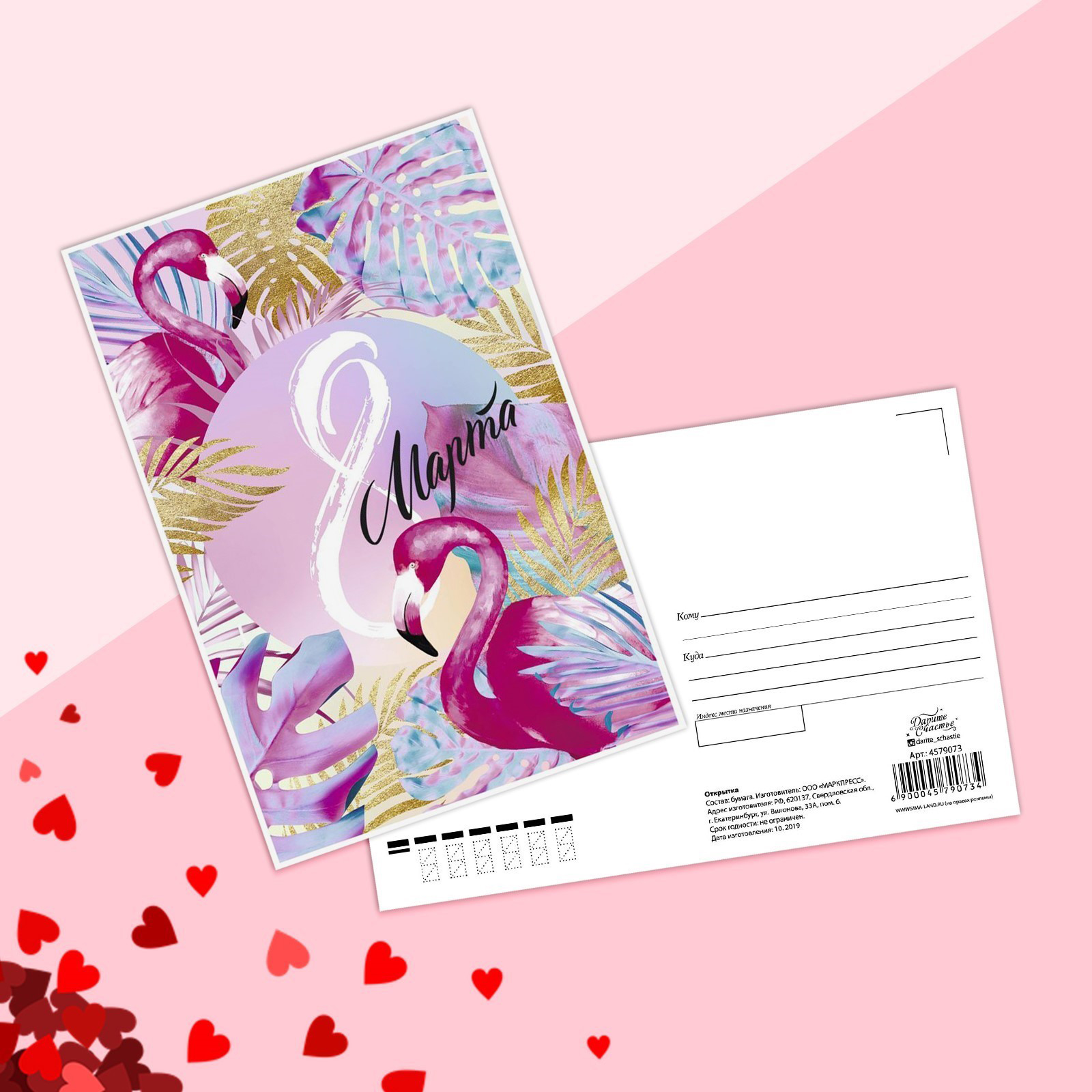 Почтовая карточка «8 марта» фламинго, 10 х 15 см