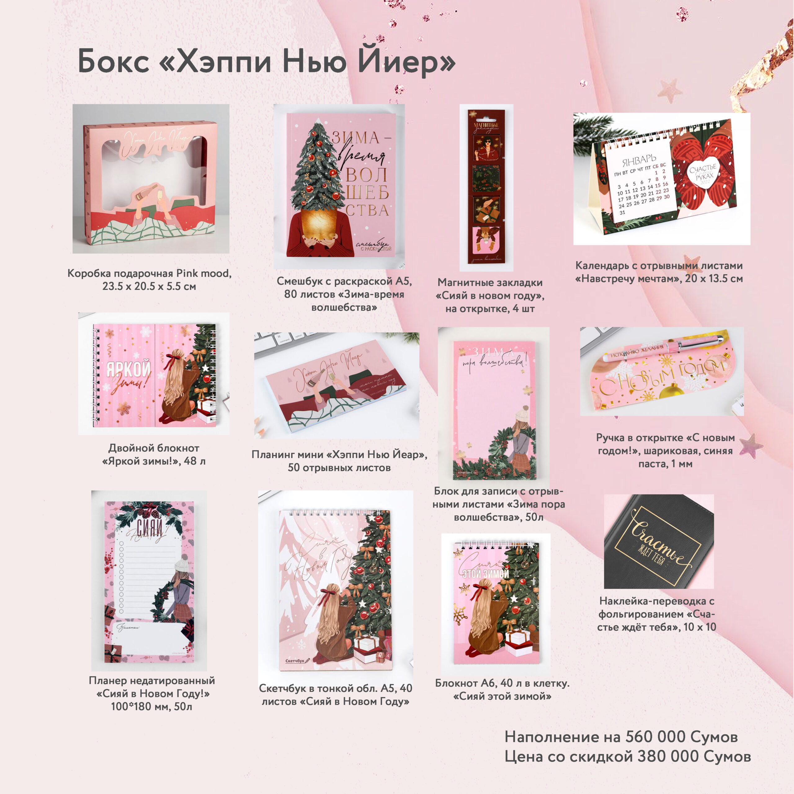 Внутри:rnКоробка подарочная Pink mood, 23.5 х 20.5 х 5.5 смrnСмешбук с раскраской А5, 80 листов «Зима-время волшебства»rnПланер недатированный «Сияй в Новом Году!» 100*180 мм, 50 листовrnБлок для записи с отрывными листами «Зима пора волшебства», 125х75 50лrnБлокнот А6 в клетку «Сияй этой зимой»- 40 листовrnДвойной блокнот скетчбук «Яркой зимы!», 48 лrnКалендарь с отрывными листами «Навстречу мечтам», 20 х 13.5 смrnМагнитные закладки «Сияй в новом году», на открытке, 4 штrnПланинг мини «Хэппи Нью Йеар», 50 отрывных листовrnРучка в открытке «С новым годом!», шариковая, синяя паста, 1 ммrnСкетчбук в тонкой обложке А5, 40 листов «Сияй в Новом Году»rnНаклейка-переводка с фольгированием «Счастье ждёт тебя», 10 x 10 см